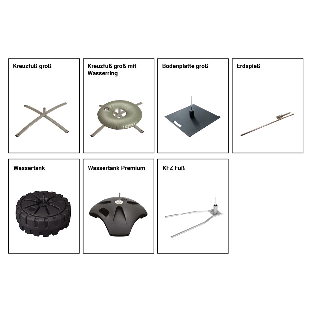 Damit die Fahne stabil und sicher steht – egal ob auf Asphalt, Rasen, Sand oder Schnee - ist die Wahl des richtigen Standfußes entscheidend. Für die Beachflag Drop sind verschiedene Kreuzfüße, Bodenplatten, ein Wassertank, ein KFZ-Fuß und ein Betonfuß erhältlich, wenn die Fahne auf den Boden gestellt werden soll sowie ein Erdspieß für die Verankerung im Boden. Bei Kreuzfüßen und Bodenplatten empfiehlt es sich je nach Einsatzort und Größe der Beachflag, für eine optimale Stabilität einen Wasserring zur Beschwerung zu verwenden.