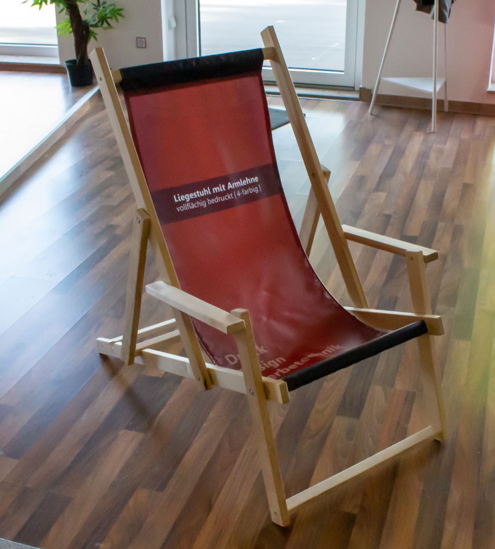 Hochwertige Holzklappliegestühle mit Armlehne mit Monaco Premium Stoff von DPS Druck Brauneis aus Pfarrkirchen, München und Niederbayern. Durch den extrem reiß- und abriebfesten Stoff und dem hochwertigen Latexdruck ist der Stuhl ein echtes langlebiges premium Produkt.