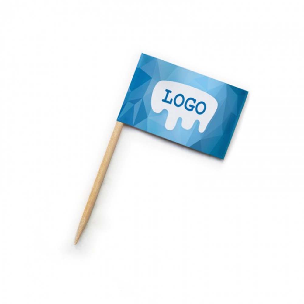 Standard Zahnstocher Fähnchen als Käsepicker, Minifähnchen, Kostprobenpicker oder Portionsfähnchen. Produktion ab 100 Zahnstocher-Fähnchen im 4-farbigen Digitaldruck. Größere Auflagen der Zahnstocher Fähnchen im Offsetdruck möglich.